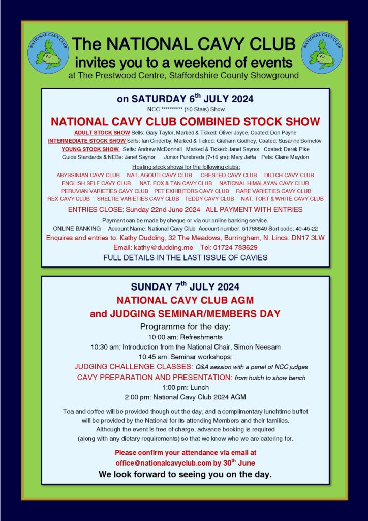 This month’s magazine brings you all the details of the upcoming National Cavy Club Combined Stock Show, which will be held at Stafford County Showground on Saturday 6th July. And also the National’s 2024 AGM and ever popular Judging Seminar, which will be held at Stafford on Sunday 7th July. The Seminar is open to all interested Members and their families, whether they aspire to judge or not, and this years themes are Judging Challenge Classes and Show Preparation and Presentation in Different Breeds.